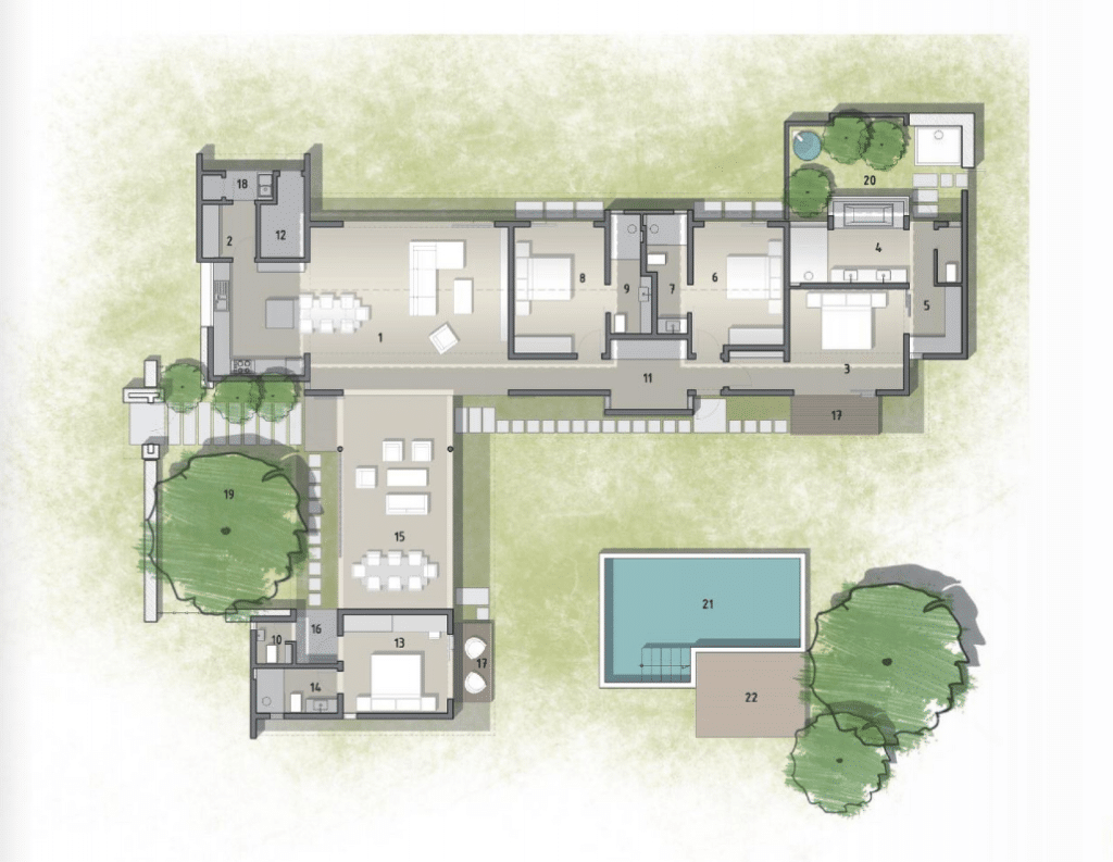 L’espace de vie dispose d’un séjour, salle à manger, cuisine moderne et intégralement équipée, s’ouvrant sur une varangue de 29.1 m2 couverte avec terrasse et une deuxième salle à manger et d’un salon qui donne sur la piscine de 31 m2 environ et un superbe jardin paysager.