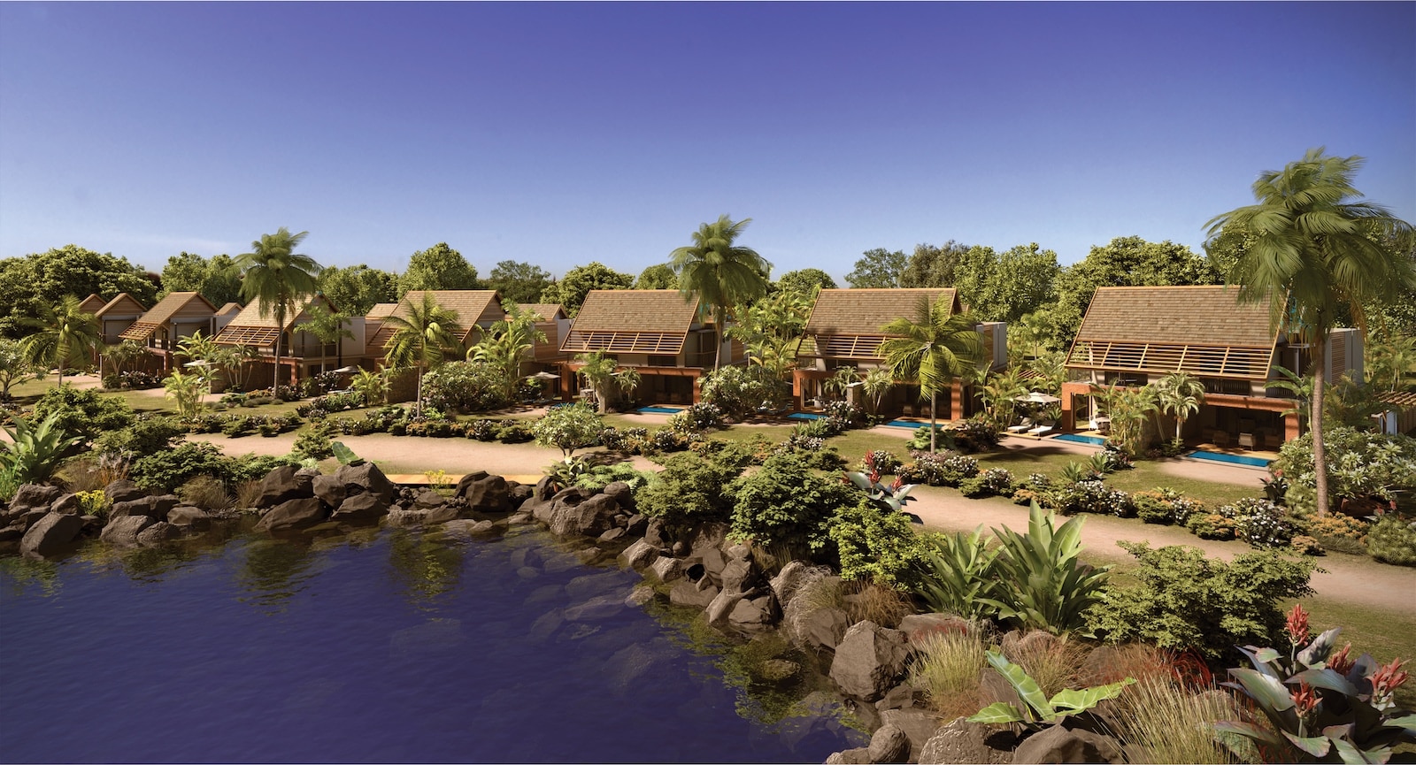 Les appartements sont situés au rez-de-chaussée ou au premier étage. Leur design revisite celle des bungalows côtiers mauriciens traditionnels, tout en restant fidèle à leur style et esprit. La salle de séjour, la salle à manger et la cuisine s’ouvrent sur un jardin tropical pour les appartements du rez-de-chaussée, ou un balcon pour les appartements du premier étage. Tous les appartements offrent une vue dégagée sur un éden de verdure et d’étangs naturels.