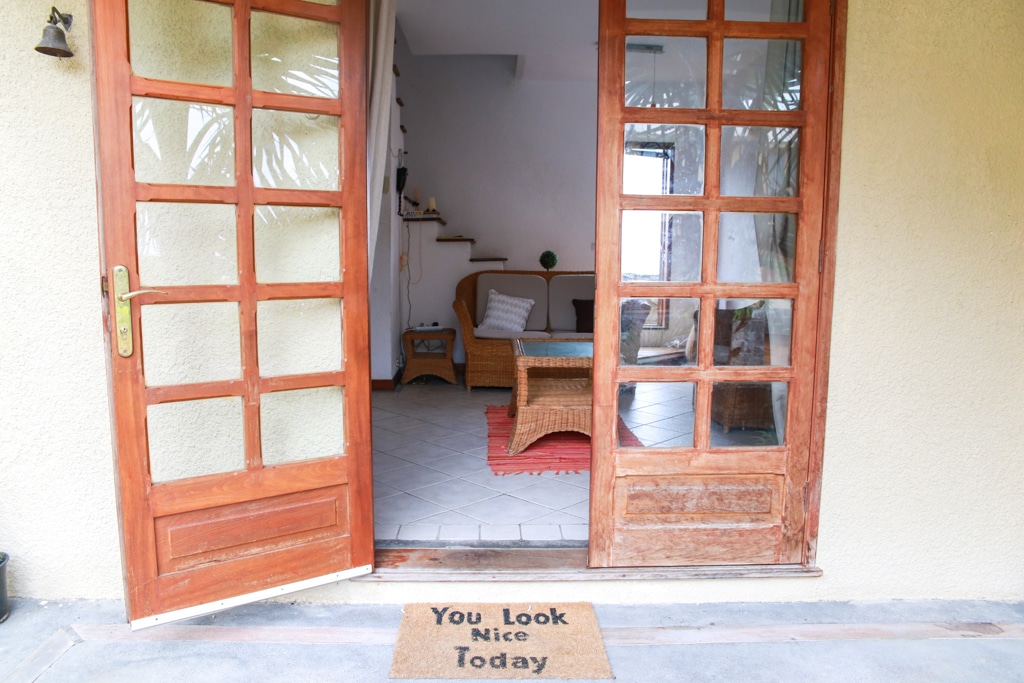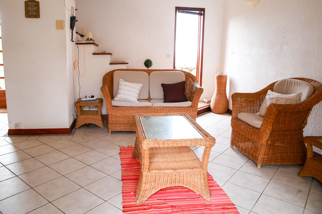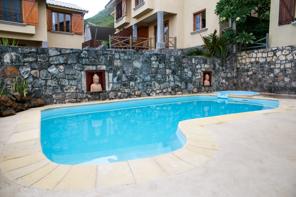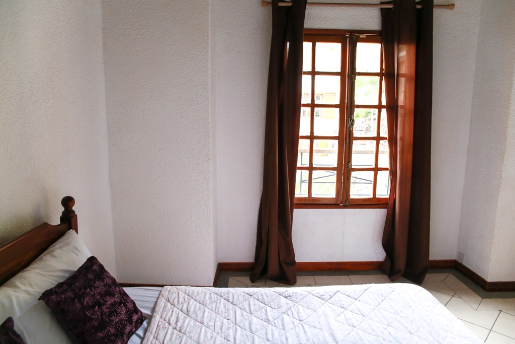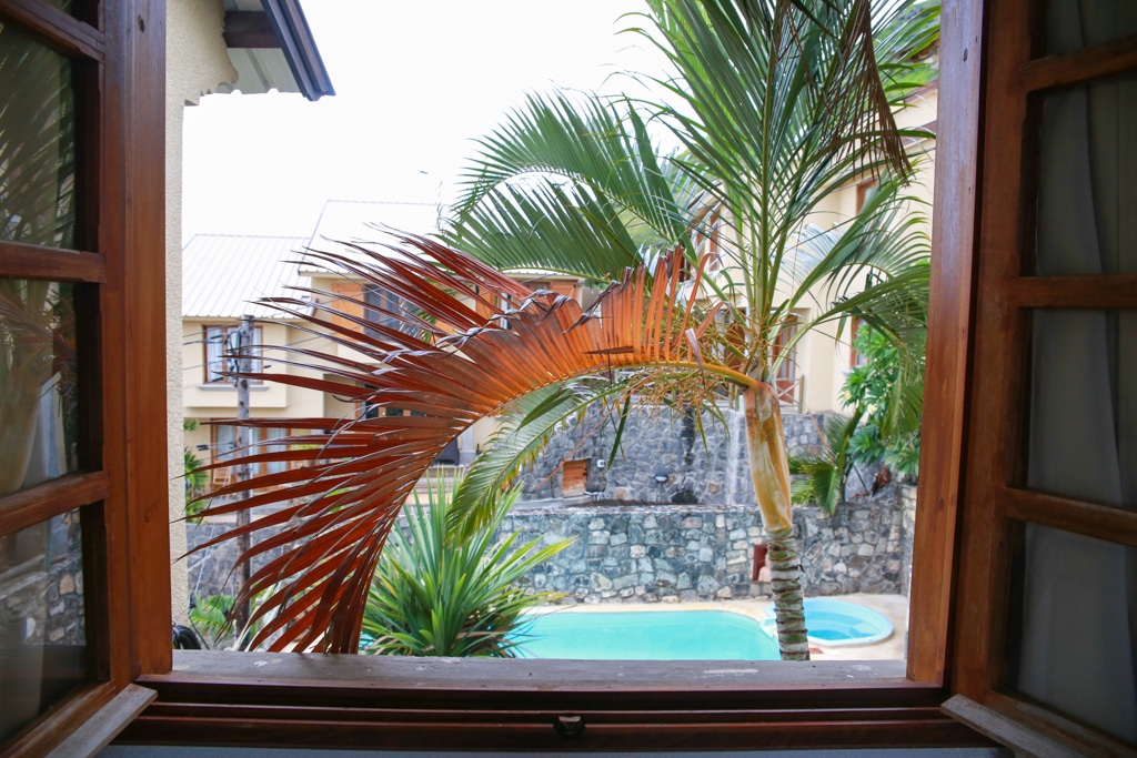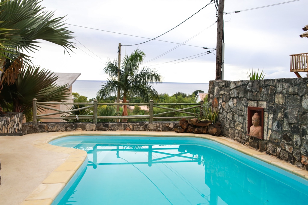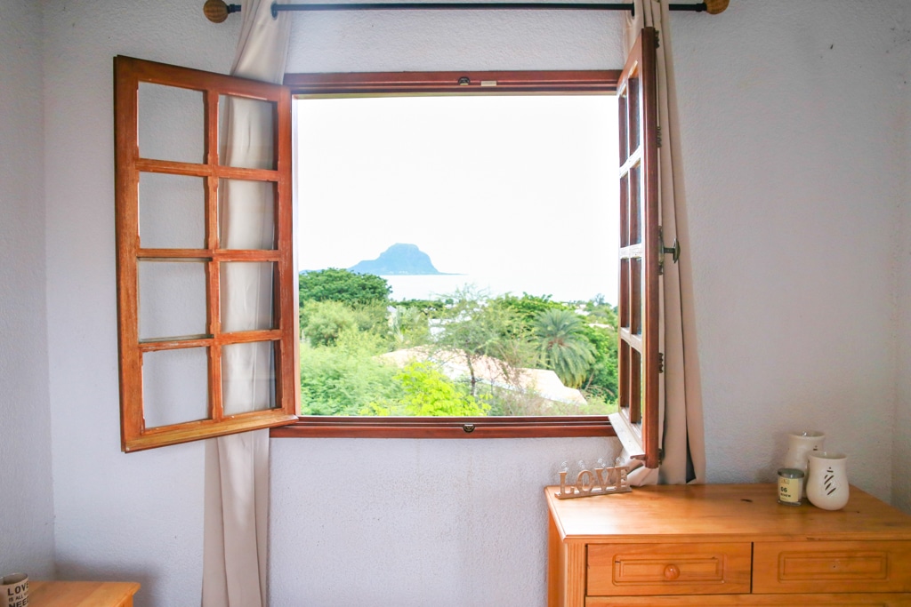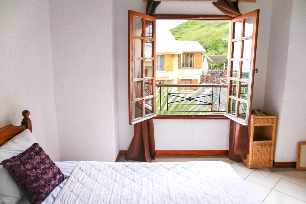 - Au premier étage, il y a deux chambres doubles avec de grandes fenêtres et une chambre vous offre une vue fabuleuse sur le Morne et l’autre ouvre sur la piscine.