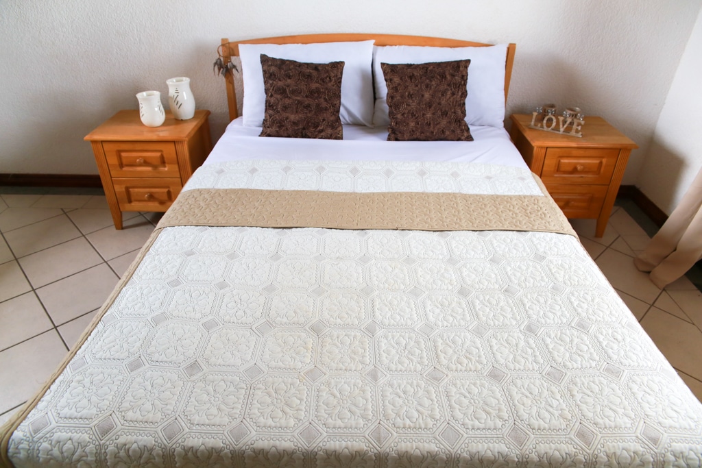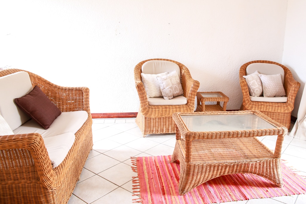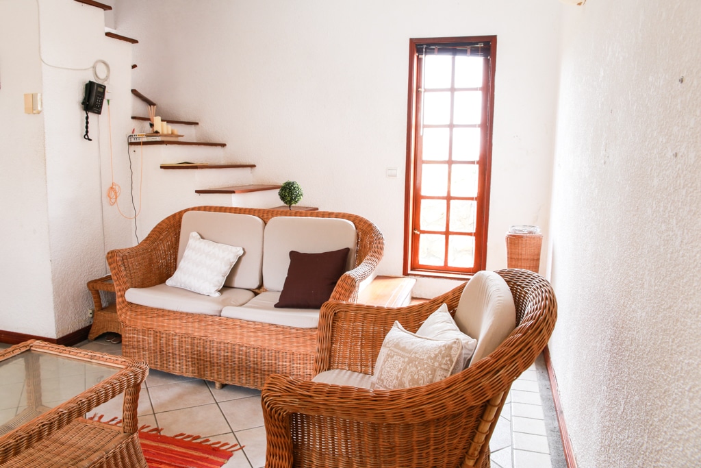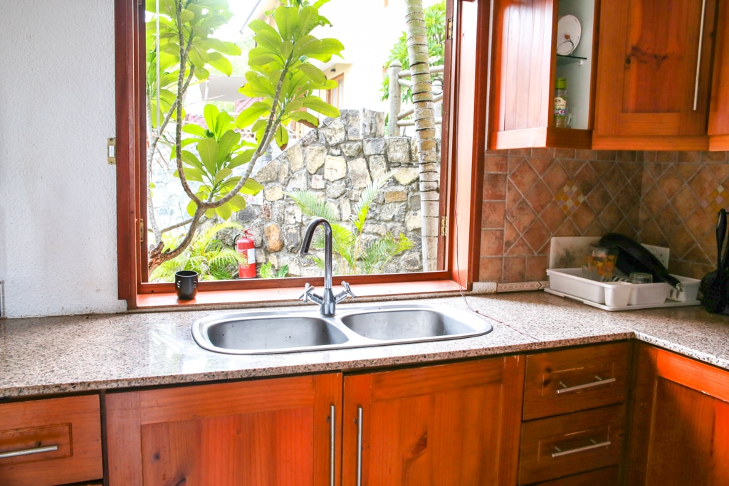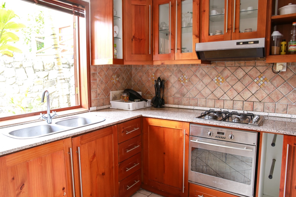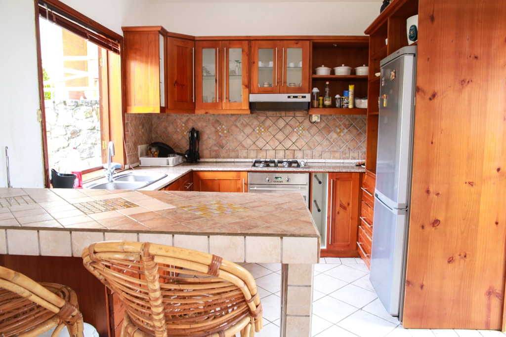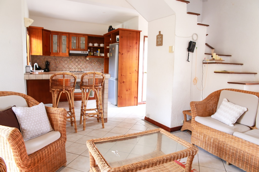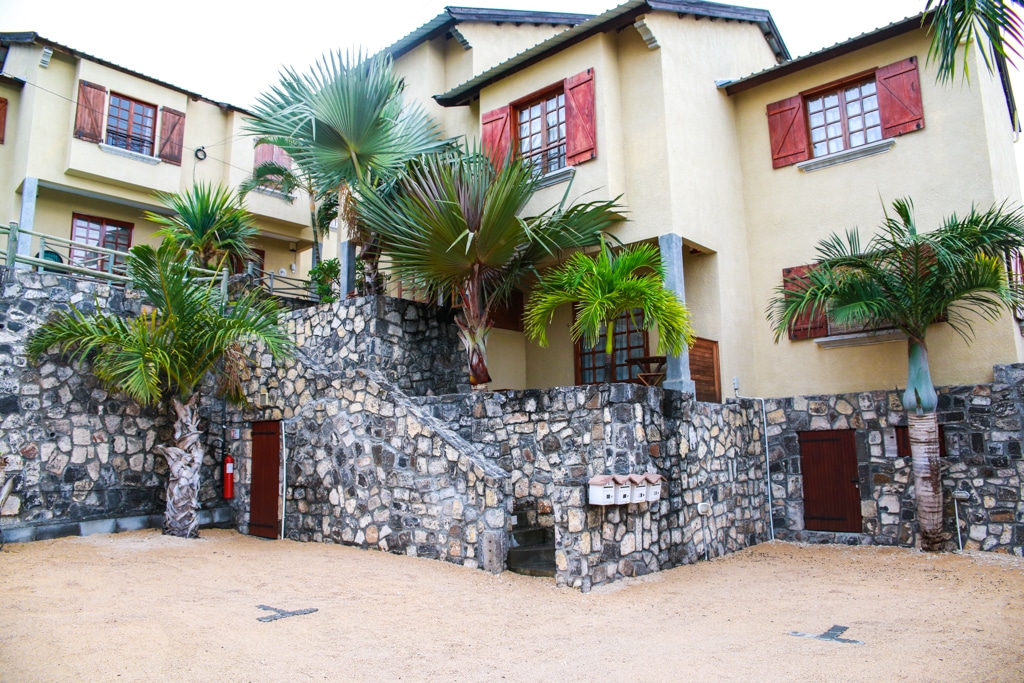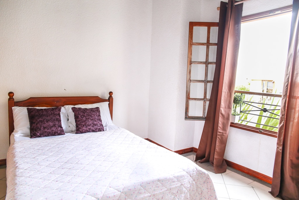 - Au premier étage, il y a deux chambres doubles avec de grandes fenêtres et une chambre vous offre une vue fabuleuse sur le Morne et l’autre ouvre sur la piscine.